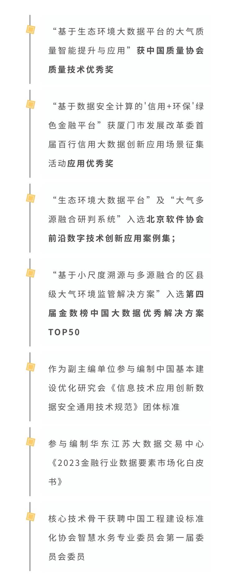 截至目前,天融科技公司及各业务线已累计获得62项资质,17个奖项,并参与制定了5项行业及团体标准,150项软件著作权,72项专利,同时有2人次作为行业组织的专家。未来,天融科技将继续积极沉淀软件及数据技术服务实践经验,加快技术积累在生态环境数字化应用领域的成果转化,提升公司核心科技竞争力的同时,为地方政府及行业企业提供高质量产品及服务,赋能绿色发展,助力建设美丽中国!