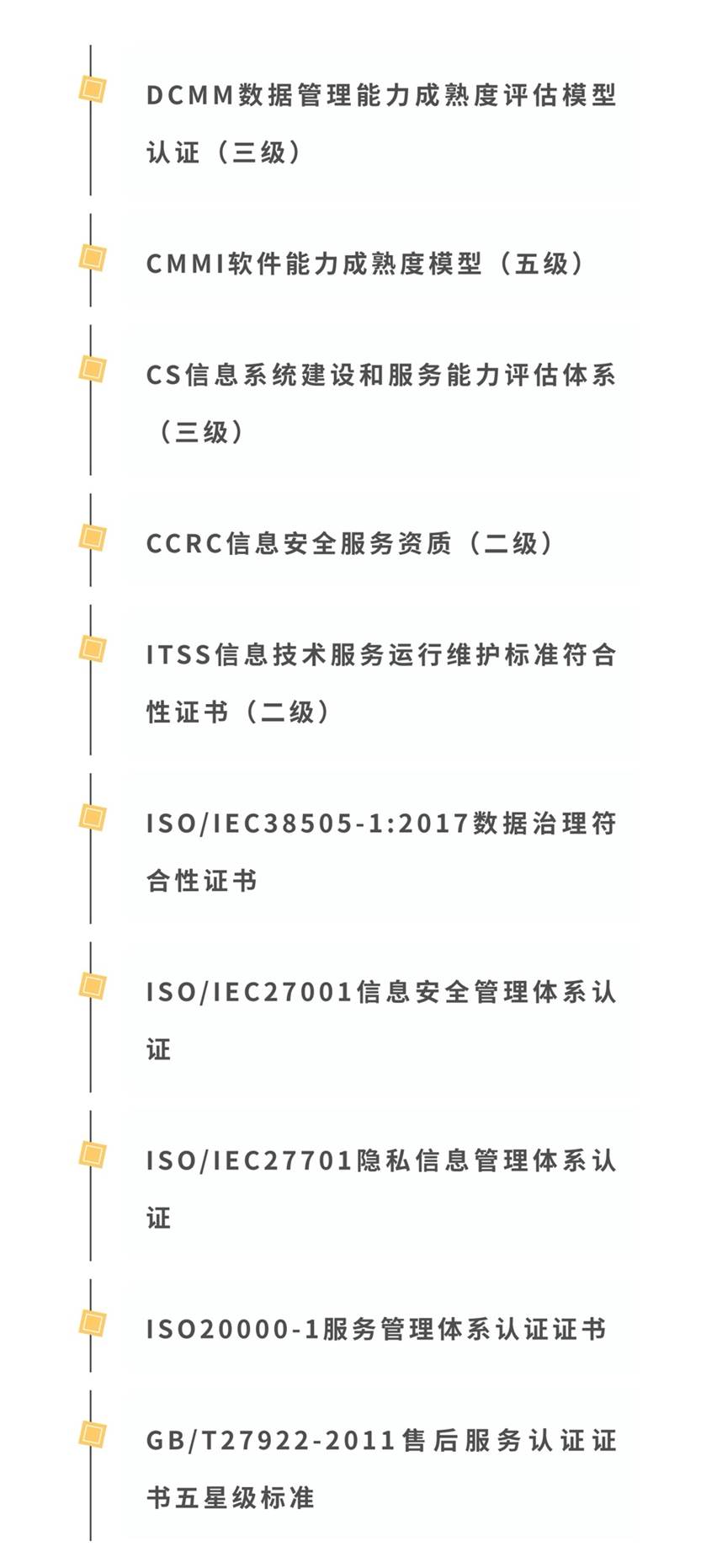 系列资质证书的成功取得,从不同维度证实公司已具备行业高度认可的信息化系统开发及运维服务、数据战略/架构/治理/应用/安全/质量等综合能力。