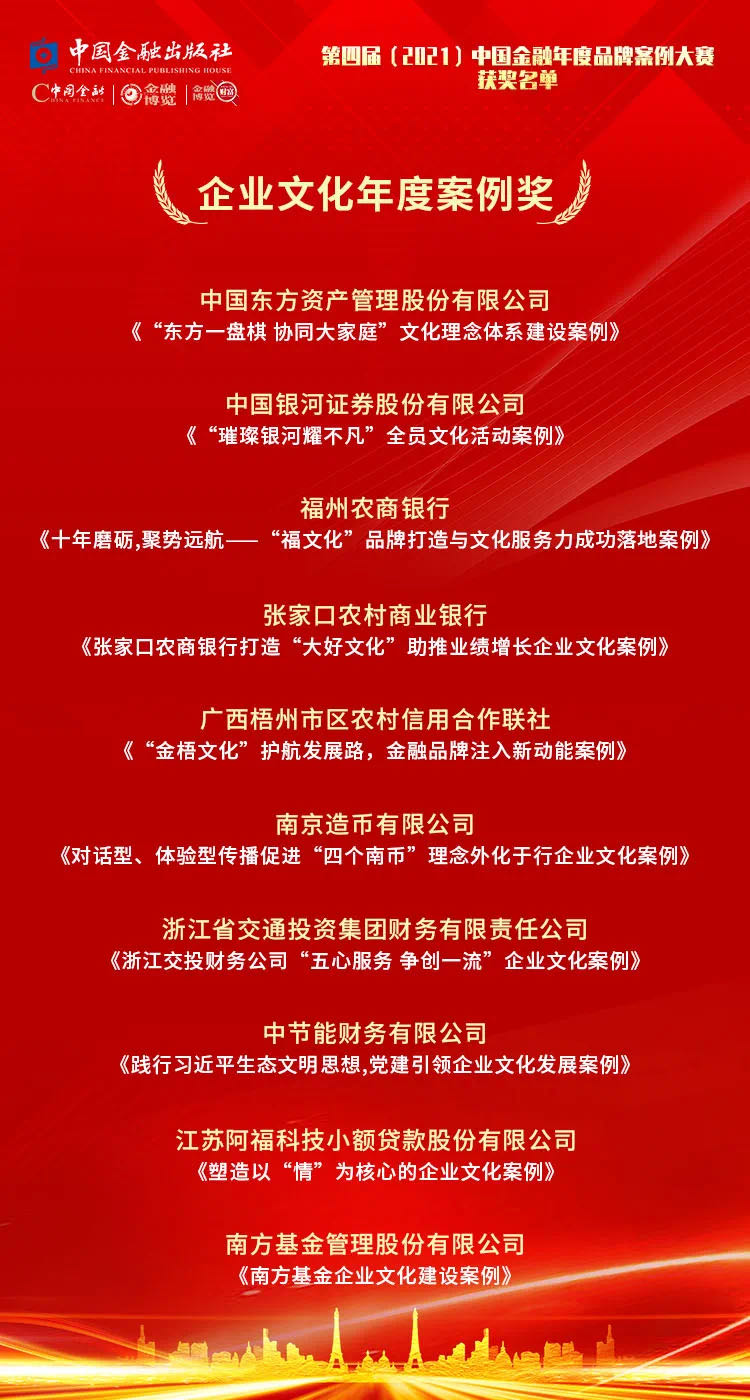 近日,由中国金融杂志社主办的“第四届(2021)中国金融年度品牌案例大赛”公布最终获奖名单,中节能财务有限公司《践行习近平生态文明思想 党建引领企业文化发展案例》荣获企业文化年度案例奖。